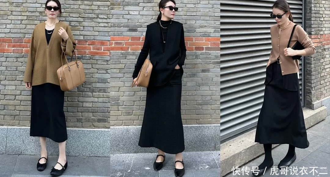 慵懒通勤:米色针织开衫毛衣+黑色醋酸半裙,用松弛感消解职场的紧绷,选择一双卡其色的尖头鞋点亮造型。
