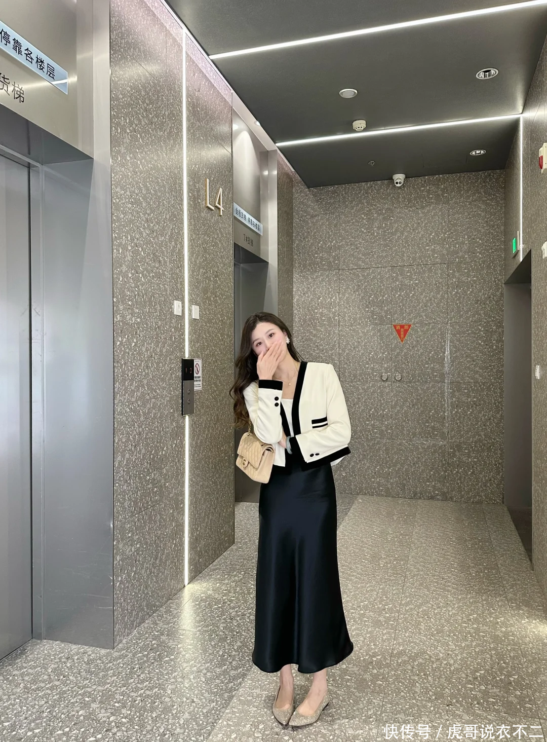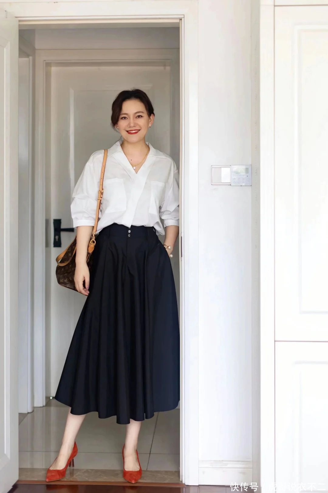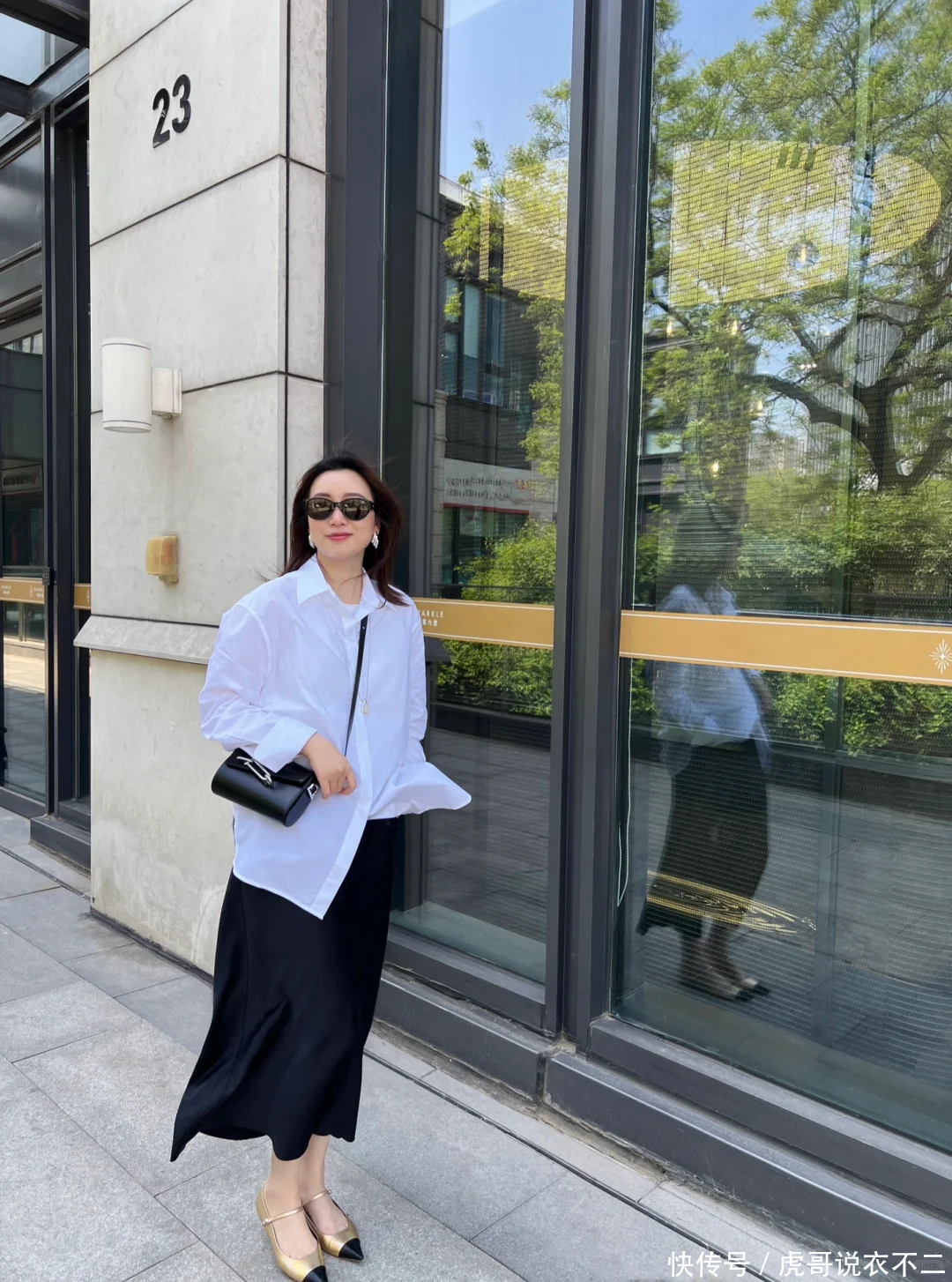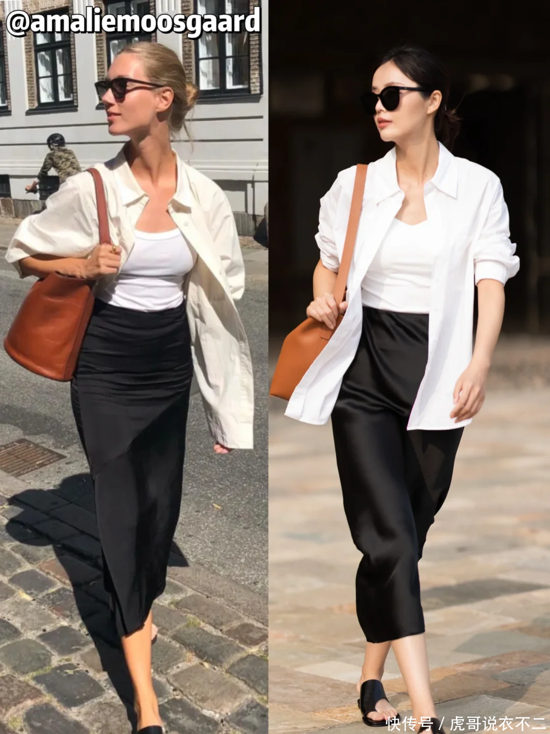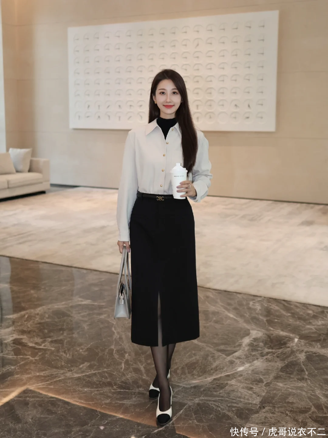 撞色觉醒:简约的白衬衫与黑裙形成视觉冲击,将衬衫下摆塞进裤腰,瞬间拉长下半身比例。