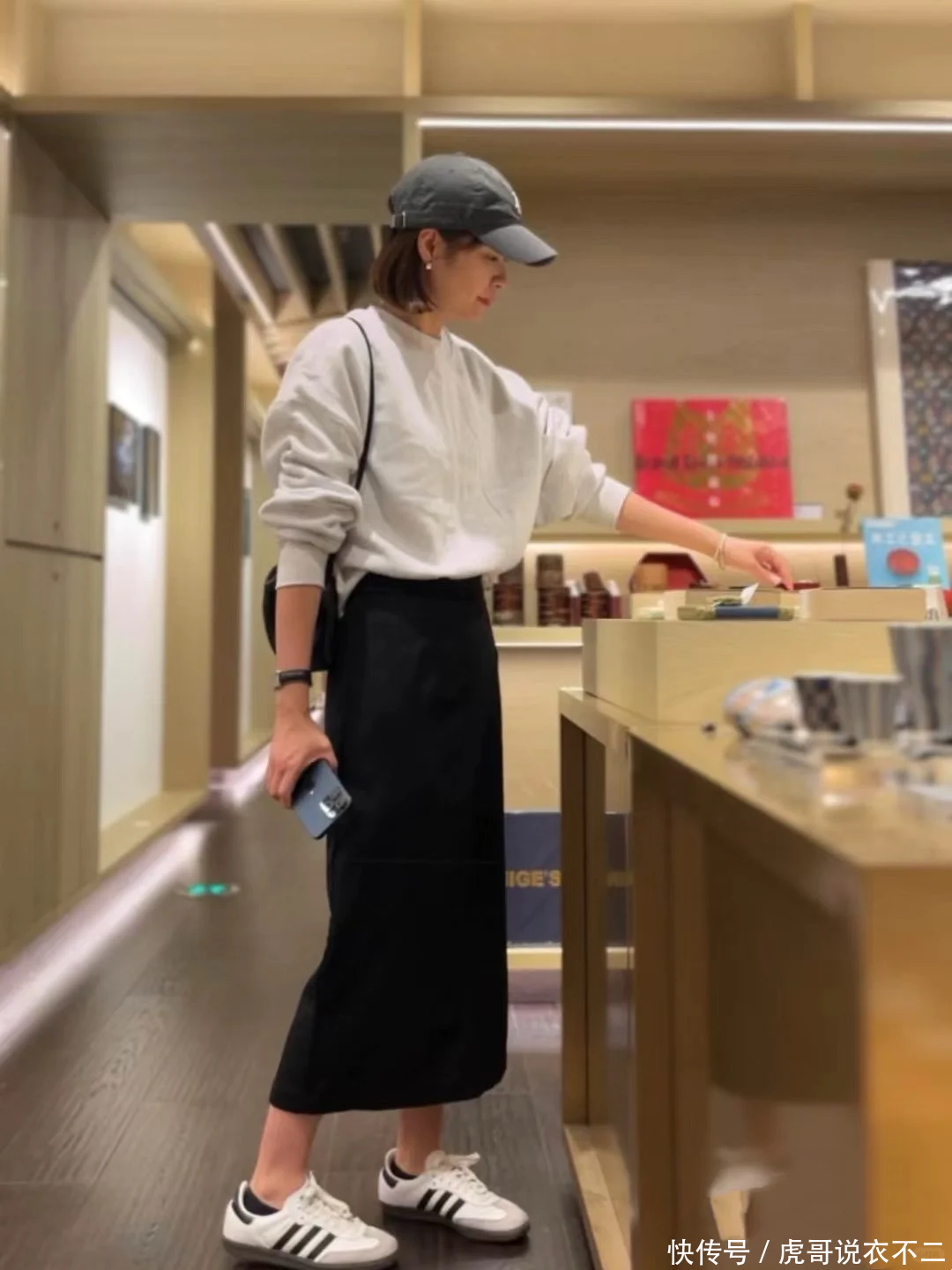 学院风回潮:米色卫衣+直筒裙+德训鞋,用报棒球帽打造运动感,裙长恰好露出脚踝最纤细部位,打造清新减龄的学院风。