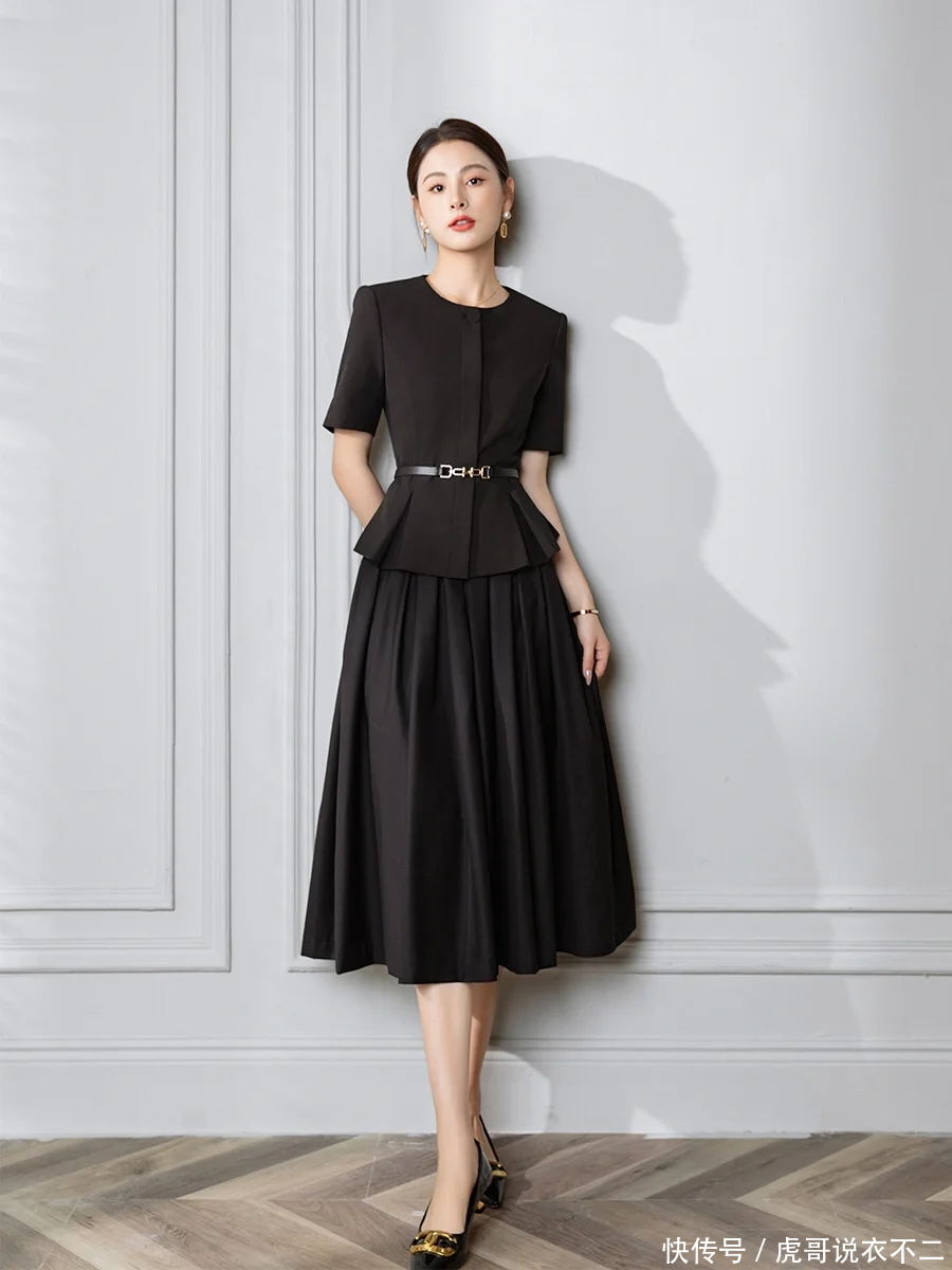 二、赫本裙:复古轮廓的现代演绎剪裁密码:高腰A字伞摆设计堪称"人体美化师",既能藏匿腰腹赘肉,又通过外扩裙型反衬腰肢纤细。选择带有暗纹的哑光面料,能有效避免黑色长裙的沉闷感。
