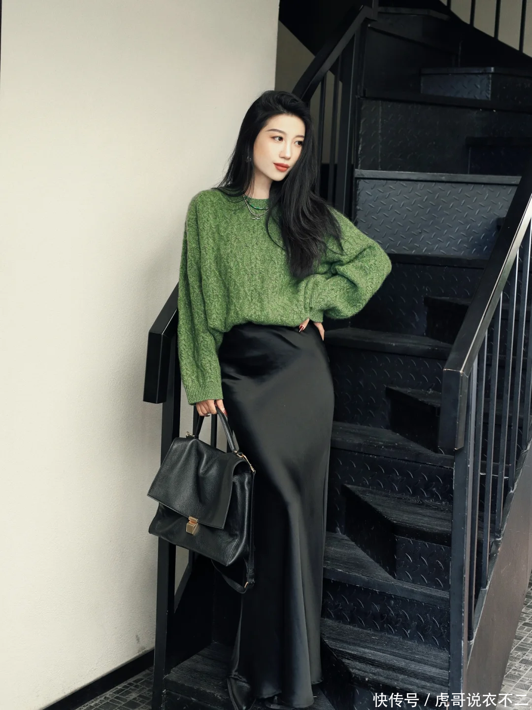 通勤升级:绿色毛衣+黑色鱼尾裙,针织与鱼尾裙的混搭意外和谐,展现都市丽人的多面魅力。